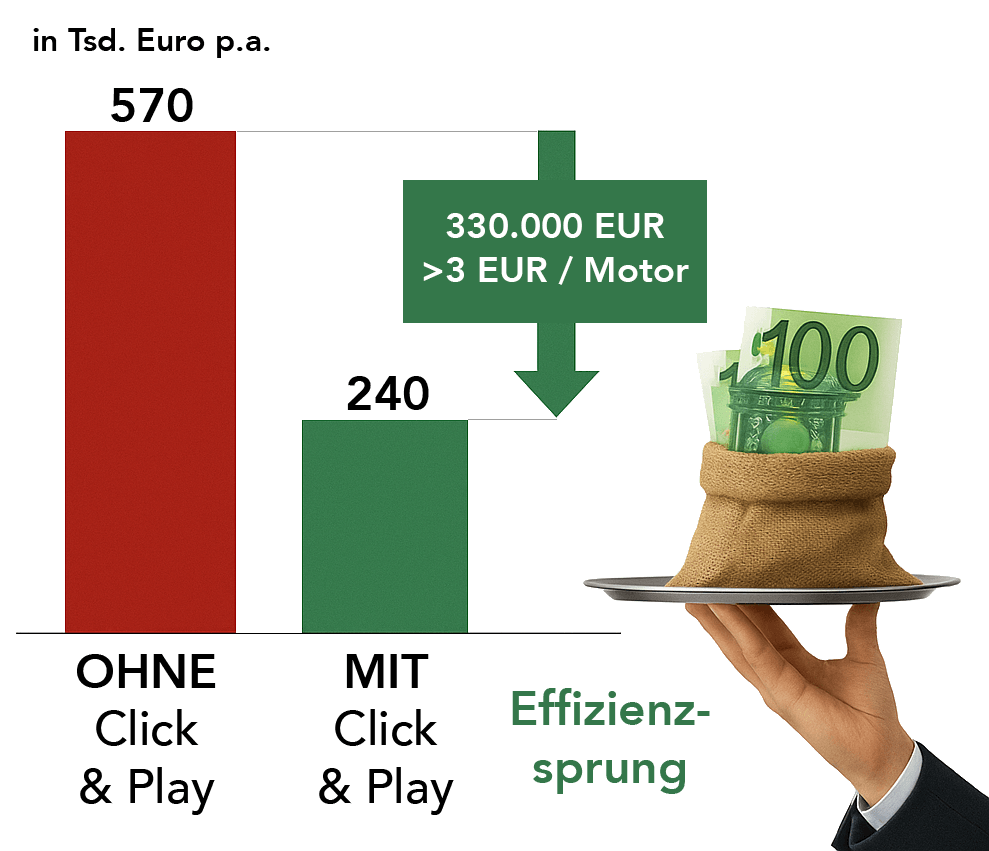 Wie können die hohen Montagekosten im Elektromotorenbau drastisch reduziert werden? Unsere Antwort: „Click & Play“! Mit dem Einsatz unserer TMC MR 2. Generation und der damit möglichen automatisierten Montage konnten die Kosten um 0,5 Mio. Euro pro Jahr gesenkt werden.